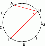 c: Punkty a b c d e f g h i dzielą okrąg na 9 równych łuków. Miara zaznaczonego na rysunku kąta