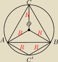 promieniu R = 20 cm. Wiedząc, że ∠ AOB = 120o, oblicz pole trójkąta ABC oraz promień okręgu